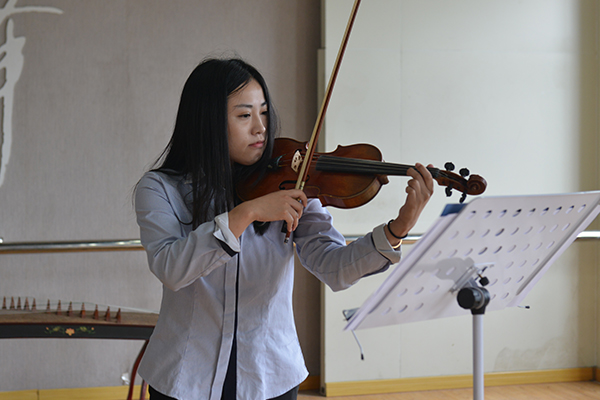 比赛中,每位教师充分发挥个人的专业优势,展示了扎实的专业基本功:扬琴独奏曲《黄河》采用冼星海《黄河大合唱》第四乐章《黄河谣》的主旋律改编,描绘出祖国山河气势磅礴、雄伟壮丽的画面;小提琴演奏《莫扎特第三协奏曲》音色优美、欢快流畅,跳跃的节奏焕发着青春的活力;古典舞表演《木兰卸甲》描绘了木兰从军归来顽强不屈、不畏世俗的巾帼女英雄形象……精彩节目展示渗透了中西方音乐文化的多样性。在最后的课程答辩中,老师们结合教学实际和课程课标研究,阐述了对课程、课堂教学、学科素养及相关教育理论问题的理解,思路清晰、表达流利,现场洋溢着浓厚的研讨氛围。