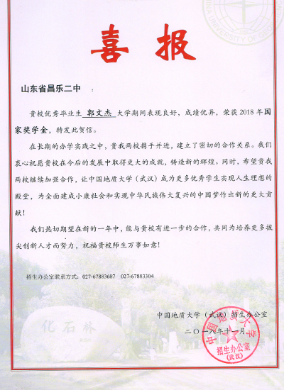 ? ? ? ? 近日,中国地质大学、华北电力大学等国内著名大学为我校寄来感谢信,感谢我校为其输送的大批优秀学子。其中,我校优秀毕业生郭文杰在中国地质大学表现良好,成绩优异,荣获2018年国家奖学金,受到了同校师生的一致好评。我校孙文慧同学 ...