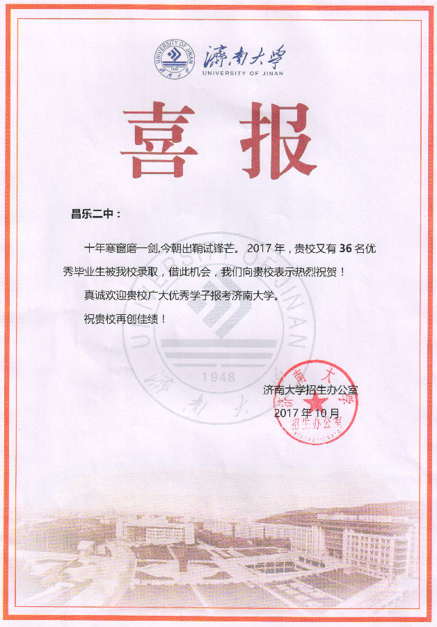 喜报频传,近日我校又收到一封来自济南大学的感谢信,感谢我校在2017年向济南大学输送36名优秀学子,并祝愿我校再创佳绩。这也是既青岛大学、北京科技大学、长春理工大学之后,我校收到来自高校的又一封感谢信。